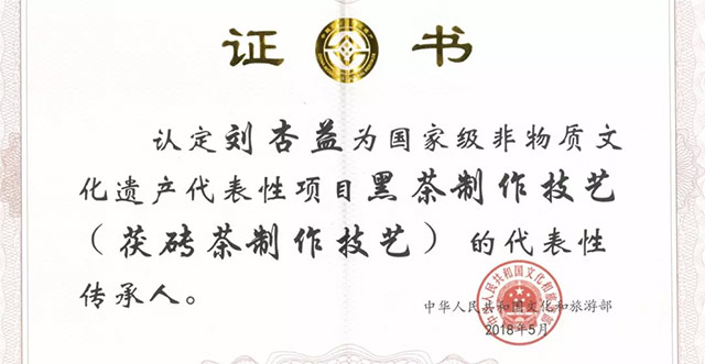 10月9日,益陽(yáng)市非物質(zhì)文化遺產(chǎn)項目國家級省級代表性傳承人證書(shū)頒發(fā)儀式在益陽(yáng)舉行,公司副總經(jīng)理劉杏益榮獲第五批國家級非物質(zhì)文化遺產(chǎn)代表性項目代表性傳承人、公司質(zhì)管部經(jīng)理黃燕榮獲第四批省級非物質(zhì)文化遺產(chǎn)代表性項目代表性傳承人。益陽(yáng)茯磚茶制作技藝因其悠久的歷史文化、精湛的傳統技藝、獨特的品質(zhì)要求被列入國家級非物質(zhì)文化遺產(chǎn)保護名錄。