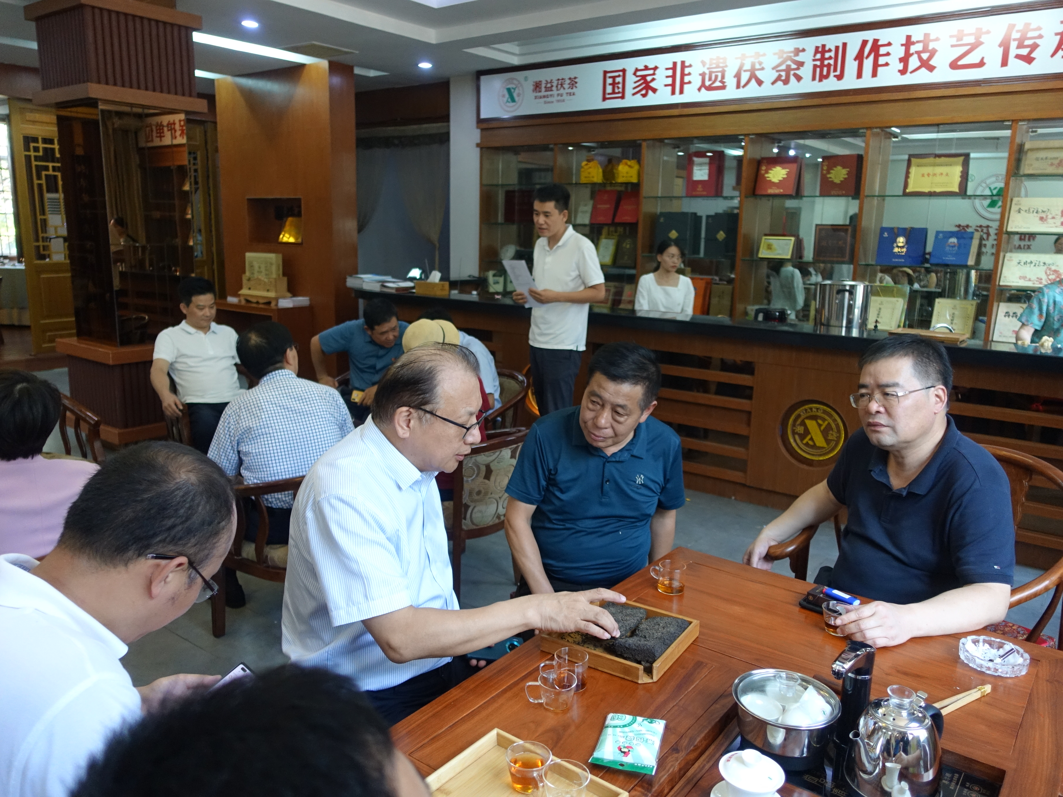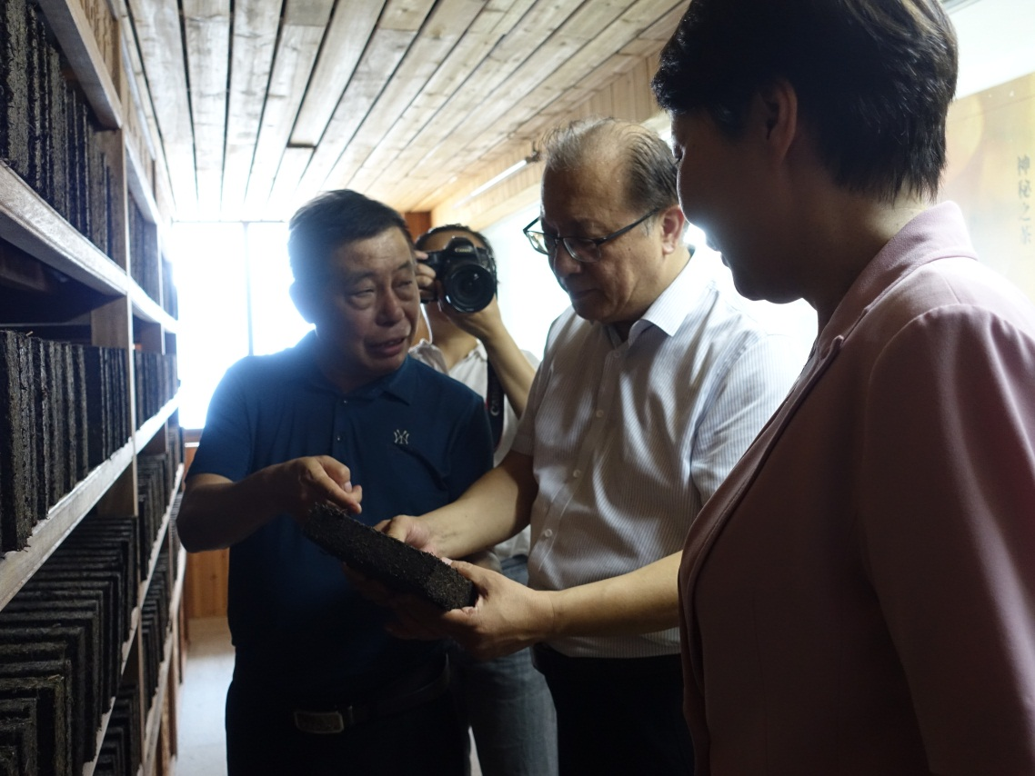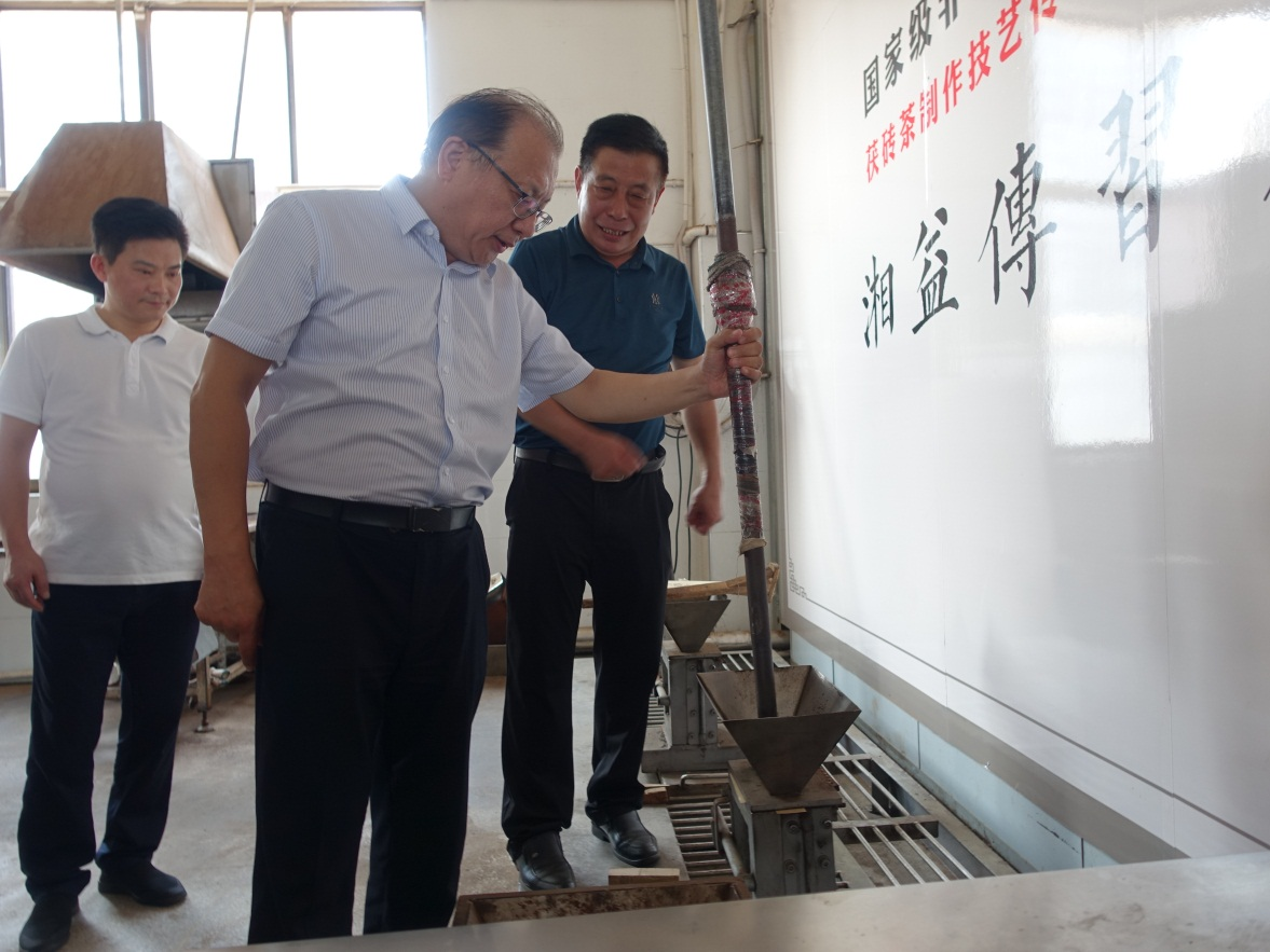 9月26日,文化和旅游部非遺司司長(cháng)王晨陽(yáng)、綜合處處長(cháng)李繪新、管理處處長(cháng)王暉、管理處干部李娃,中國茶葉博物館研究館員朱慧穎、中國農業(yè)科學(xué)院研究所二級研究員魯成銀,中國藝術(shù)研究院文化戰略發(fā)展研究中心主任羅微,湖南省文化和旅游廳副廳長(cháng)張?;?、非遺處處長(cháng)顏喜、副處長(cháng)肖正湖等,到公司考察調研國家非物質(zhì)文化遺產(chǎn)茯磚茶制作技藝的傳承保護與發(fā)展情況。益陽(yáng)市副市長(cháng)楊智華、副秘書(shū)長(cháng)王國保、宣傳部副部長(cháng)、文旅廣體局黨組書(shū)記、局長(cháng)陶漢文、副局長(cháng)羅衛榮、文化遺產(chǎn)科科長(cháng)蔡愛(ài)武等陪同調研。公司董事長(cháng)彭雄根、總經(jīng)理陳小春、副總經(jīng)理、國家茯磚茶制作技藝非物質(zhì)文化遺產(chǎn)代表性傳承人劉杏益等熱情接待。